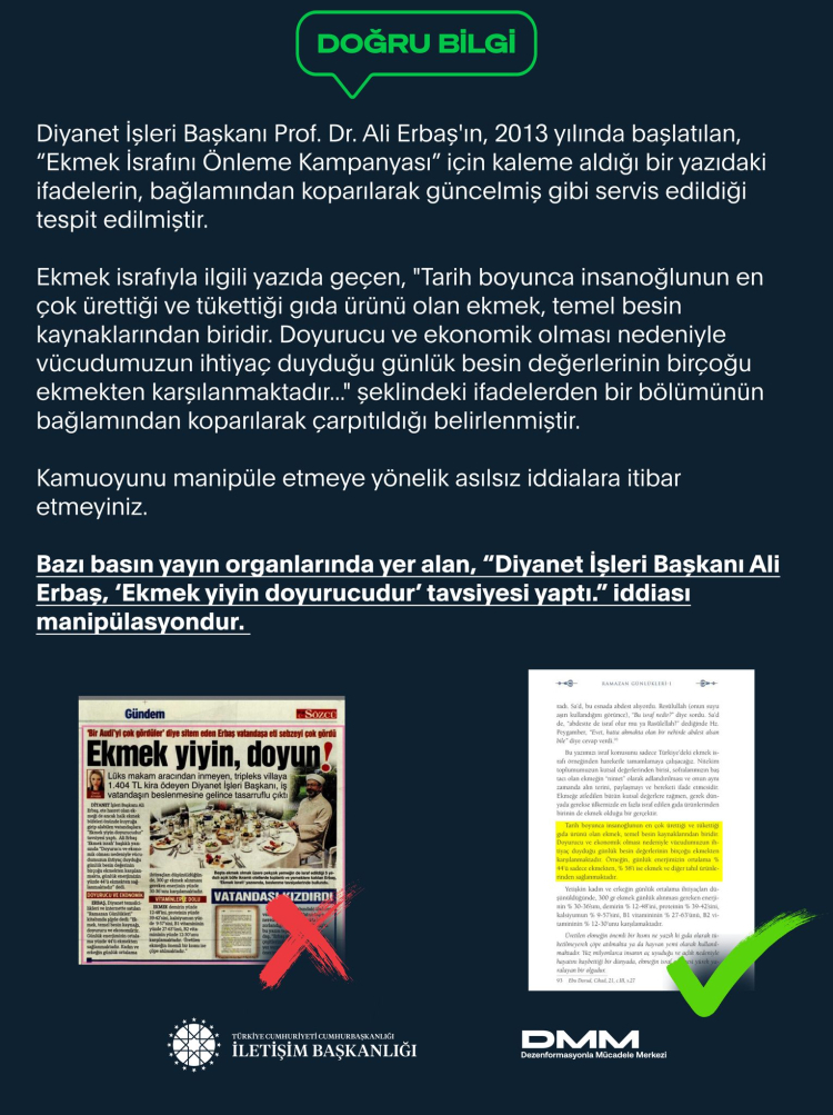 Dezenformasyonla Mücadele Merkezi tarafından yapılan açıklamada, "Diyanet İşleri Başkanı Prof. Dr. Ali Erbaş'ın, 2013 yılında başlatılan, “Ekmek İsrafını Önleme Kampanyası” için kaleme aldığı bir yazıdaki ifadelerin, bağlamından koparılarak güncelmiş gibi servis edildiği tespit edilmiştir. Ekmek israfıyla ilgili yazıda geçen, "Tarih boyunca insanoğlunun en çok ürettiği ve tükettiği gıda ürünü olan ekmek, temel besin kaynaklarından biridir. Doyurucu ve ekonomik olması nedeniyle vücudumuzun ihtiyaç duyduğu günlük besin değerlerinin birçoğu ekmekten karşılanmaktadır..." şeklindeki ifadelerden bir bölümünün bağlamından koparılarak çarpıtıldığı belirlenmiştir. Kamuoyunu manipüle etmeye yönelik asılsız iddialara itibar etmeyiniz" ifadeleri yer aldı.