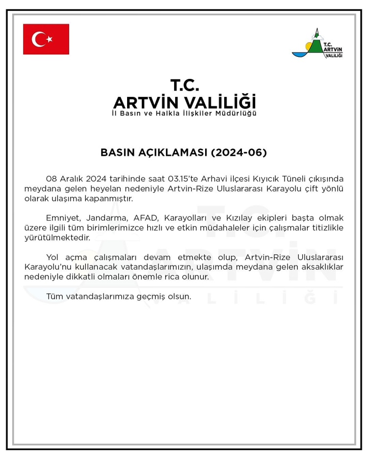 Artvin'in Arhavi ilçesi Kıyıcık Tüneli çıkışında saat 03.15'te meydana gelen heyelan dolayısıyla Artvin-Rize Uluslararası Karayolu çift yönlü ulaşıma kapandı. Heyelan sonrası bölgedeki çalışmaları titizlikle yerinde inceleyen Vali Dr. Turan Ergün, devletin tüm imkanlarının seferber edildiğini söyledi.