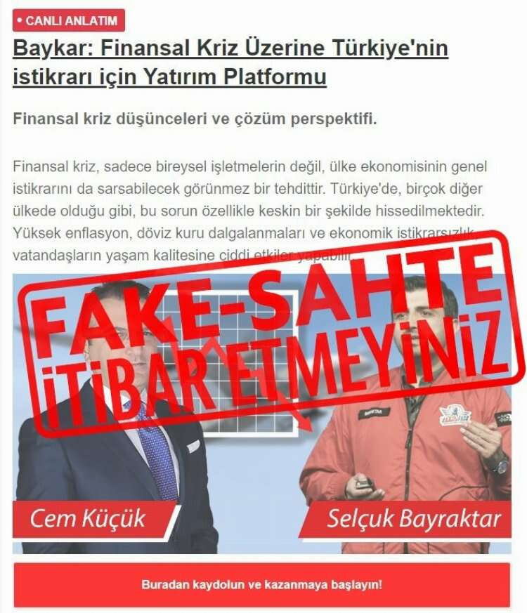 Baykar'ın X isimli sosyal medya hesabından yapılan açıklamada, “Değerli vatandaşlarımız, son zamanlarda internet siteleri ve sosyal medya platformlarında Baykar’a yatırım yaparak gelir elde edebileceğinize dair sahte ilanlar ve haber benzeri içerikler görülmektedir. Dolandırıcılığı amaçlayan bu tür ilan ve haberler tamamen gerçek dışıdır. Tanınmış gazetecilerin Baykar Yönetim Kurulu Başkanı Sayın Selçuk Bayraktar ile röportaj yapmış gibi gösterilerek yapılan yatırım çağrılarına itibar etmemenizi önemle rica ederiz. Halka açık bir şirket olmayan Baykar, hiçbir zaman yatırım teklifinde bulunmamaktadır. Karşılaştığımız bu tür dolandırıcılık girişimlerine yönelik olarak hukuki süreçler başlatılmıştır ve bu faaliyetlerin sorumlularına karşı gerekli yasal işlemler titizlikle yürütülmektedir. Şüpheli durumları lütfen resmi kanallarımız aracılığıyla bize bildiriniz. Baykar olarak vatandaşlarımızın sahte ilan ve haberlere karşı dikkatli olmasını ve bu tür çağrılara itibar etmemesini önemle rica ederiz” ifadelerine yer verildi.