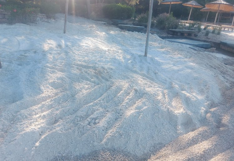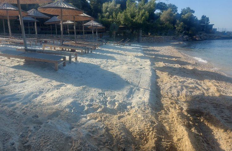 Beyaz kumun bir kısmı sahilin bir bölümüne serilirken, sahilin kalan bölümlerinde kum yığınlarının henüz serilmediği gözlendi. Sahilde küçük bir iş makinesinin de hazır beklediği görüldü.