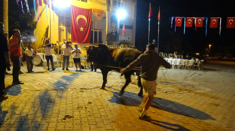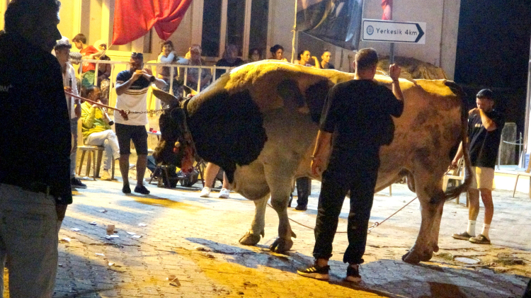 Menteşe ilçesi Algı Mahallesi'nde bu yıl 10'uncusu düzenlenecek boğa güreşi etkinliği öncesi görücüye çıkarılan boğalar, renkli ve heyecan dolu anlara sahne oldu. Köy meydanında davul zurna eşliğinde boğalar piste çıktığında, boğa sahipleri ve yakınları yanlarında getirdikleri paraları havaya savurarak etkinliğe katılanların dikkatini çekti. İzleyiciler, bu anları büyük bir heyecanla izledi ve pehlivan boğaları hayranlıkla takip etti. Ancak boğaların agresif ve güçlü yapıları nedeniyle davulcular paraları toplamakta zorlandı. Boğaların yanına yaklaşamayan davulcular, güvenlik endişesiyle piste atılan paraları toplayamadı.