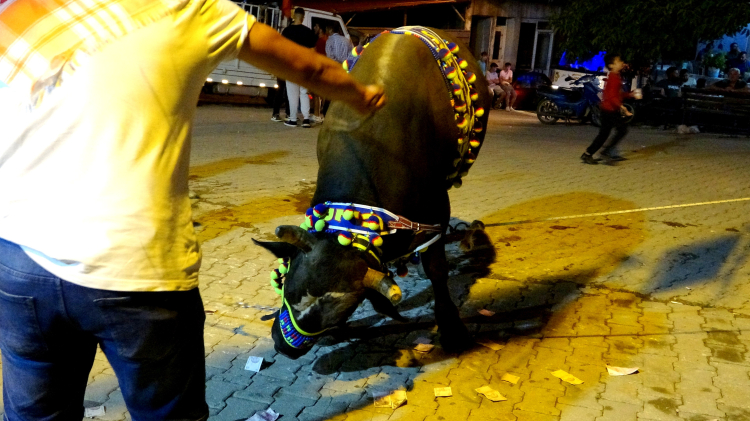 Muğla'nın Menteşe ilçesine bağlı Algı Mahallesi'nde 10'uncusu düzenlenecek boğa güreşi öncesinde davul zurna eşliğinde görücüye çıkan boğalar para yağmuruna tutuldu. Boğacılar, deste deste savurdukları paralarla büyük ilgi çekerken, boğaların yanına yaklaşmaya korkan davulcular ise bu paraları toplayamadı.