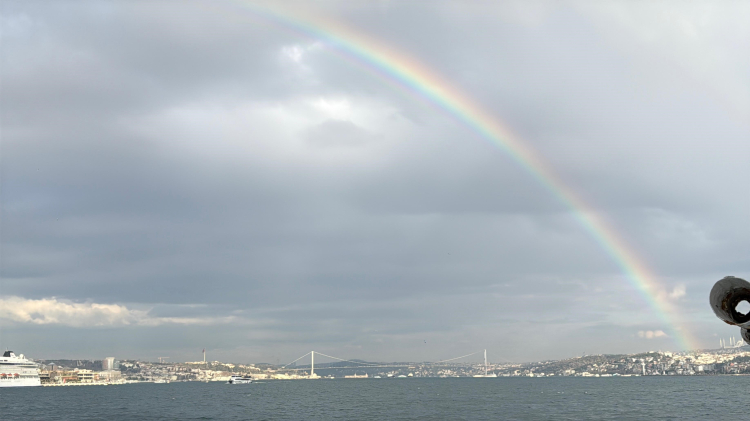 İstanbul Boğazı’nda ortaya çıkan gökkuşağı görenleri hayran bıraktı. Gökyüzünde oluşan görsel şölen vatandaşların cep telefonu kamerasına yansıdı.
