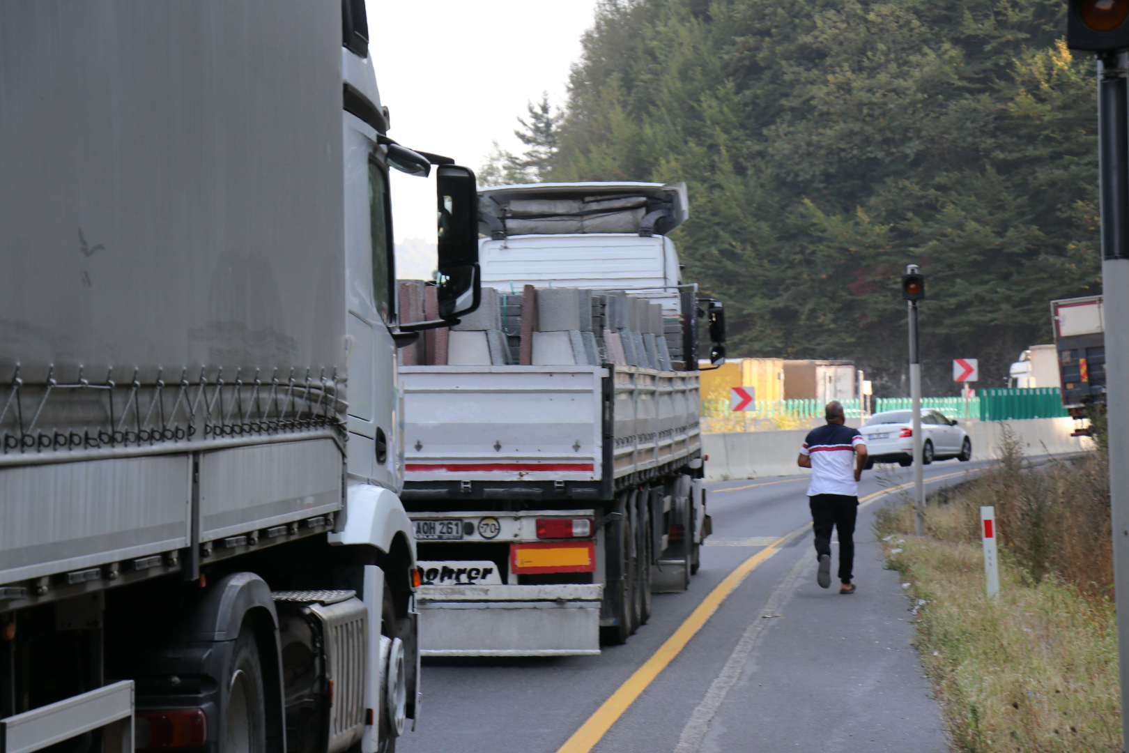 Sakarya’dan Adana’ya giden 2 şoförlü TIR'ın sürücüsü Baki Aktaş, trafiğin durduğu anlarda araçtan indi. Aracından inerek yolda yürüyen Aktaş, "3 saat oldu. Yürüyerek gidiyorum artık. Çift şoför çalışıyoruz. Araçtan indim yürüyorum. Daha hızlı gidiyorum” dedi.