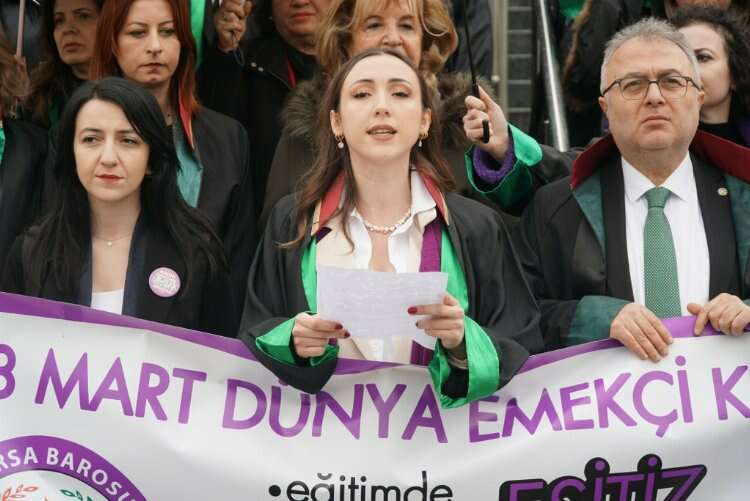 8 Mart Dünya Emekçi Kadınlar Günü nedeniyle Bursa Barosu Kadın Hakları Merkezi’nce (KHM) Adalet Sarayı önünde basın açıklaması yapıldı. Bursa Barosu Başkanı Av. Metin Öztosun, yönetim kurulu üyeleri ile avukatların katıldığı basın açıklamasını, KHM Başkanı Av. Büşra Pınar Altınoluk okudu.