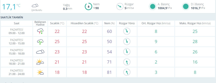 Ülke genelinin parçalı ve çok bulutlu, Marmara'nın kuzey ve doğusu, Orta ve Doğu Akdeniz'in Toroslar kesimi, İç Anadolu'nun doğusu, Karadeniz, Doğu Anadolu, Ankara ve Çankırı çevreleri ile Eskişehir'in kuzey kesiminin aralıklı sağanak ve gök gürültülü sağanak yağışlı geçeceği tahmin ediliyor. Bursa'da ise gök gürültülü sağanak yağışlı bir gün olacağı tahmin ediliyor.