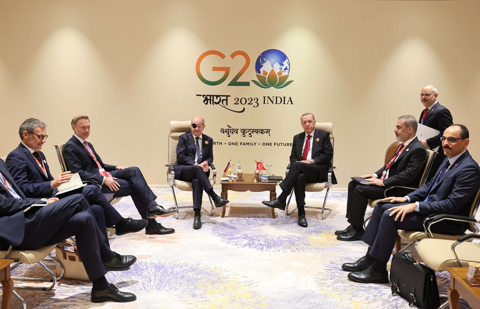 Cumhurbaşkanı Recep Tayyip Erdoğan, Hindistan’ın başkenti Yeni Delhi’deki Bharat Mandapam Uluslararası Fuar ve Kongre Merkezi'nde gerçekleştirilen G20 Liderler Zirvesi’nin ardından ikili görüşmelerini sürdürüyor. Cumhurbaşkanı Erdoğan, Almanya Başbakanı Olaf Scholz ile bir araya geldi.