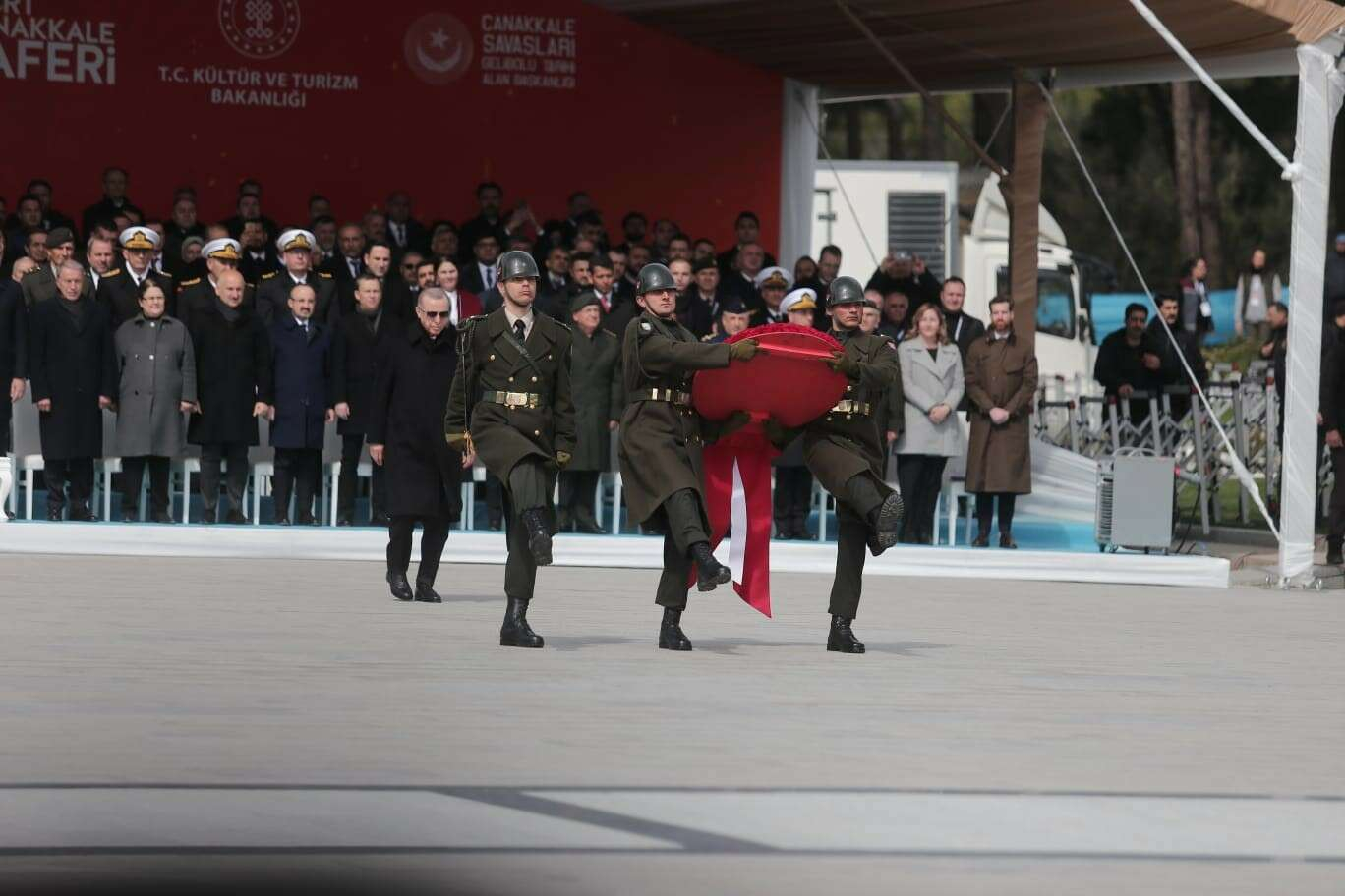 Törende konuşan Kültür ve Turizm Bakanı Mehmet Nuri Ersoy, "Bu asra kavuşan yolun ilk taşları ise işte burada, bu kutlu topraklar üzerinde sabır, sebat ve sarsılmaz bir imanla döşenmiştir. Çanakkale Muharebeleri sadece bir cephe mücadelesi değil aslen bir varoluş ve kimlik mücadelesidir. Çanakkale öylesine hassas bir çizgiydi ki, geçilseydi Türk milleti ruh ve beden olarak bütünüyle tükenecekti. Ancak atalarımız, en zor şartlar altında dahi varlığına yönelik tehditleri bertaraf etmeye muktedir olduğunu burada bir kez daha dünyaya göstermiştir. İşin aslı bu aziz millet tükenişi aklına dahi getirmemiştir. Bu, karşısındakilerin bir hayali ve dayatmasıydı. Ama binlerce yıldır olduğu gibi milletimizin iradesi karşısında bu dayatma da tarihe gömüldü. İnsan iradesinin, inanmışlık ve adanmışlığın teknolojik ve lojistik üstünlükle çarpışıp mağlup ettiği bu coğrafyada, Mehmetçik sadece milletimizin istikbalini değil yeni çağın bütün düzenini değiştirmiştir. Seyit Onbaşı, Yüzbaşı İsmail Hakkı Bey, Yüzbaşı Hafız Nazmi Bey gibi kahramanların direniş ve cesareti Irresistible, Ocean ve Bouvet gibi dönemin en muazzam savaş gemilerini burada sulara gömmüştür. Geri kalan savaş gemileri ise bir kısmı ağır olmak üzere ciddi oranda hasar görmüş; yenilmez armada diye tanımlanan bu büyük deniz gücü çok ciddi kayıplar vermiştir. İtilaf Devletleri, boğazın sularını kendilerine kapatan bu direniş karşısında kara savaşına yönelmiştir. Ancak dünyanın gördüğü en kanlı, en akıl almaz kara savaşlarından birinin yaşandığı bu topraklarda, Bigalı Mehmet Çavuş'tan Hemşire Safiye Elbi'ye kadar yiğit kadın ve erkekler işgalcilere bir kez daha aynı cevabı vermişlerdir. “Çanakkale Geçilmez” gerçeği buradan dünyaya ilan edilmiştir. 108 yıl geçti bu eşsiz tarihin, benzersiz müdafaa ve mücadelenin üstünden. Ve bu toprakların üzerinde vuku bulan, denizinde cereyan eden olayların insanlık ve vicdan, vatan ve bayrak sevgisi, mukaddesata bağlılık gibi hususlarda bizlere öğrettiği dersler, miras bıraktığı değer ve emanetler 108 yıldır anlatılmaya, öğretilmeye, yaşatılmaya devam ediyor. Dün Çanakkale'de kazanılan mücadelenin fikri ve manevi ruhu, bugün dünyanın birçok coğrafyasında devam eden benzer mücadelelerde özgürlüğüne ve kimliğine sahip çıkan herkese ilham olmayı sürdürüyor. Zira Çanakkale Muharebeleri haklı olanın güçlü olduğunun ispat edildiği; inancın imkânı galebe çaldığı yerdir" diye konuştu.