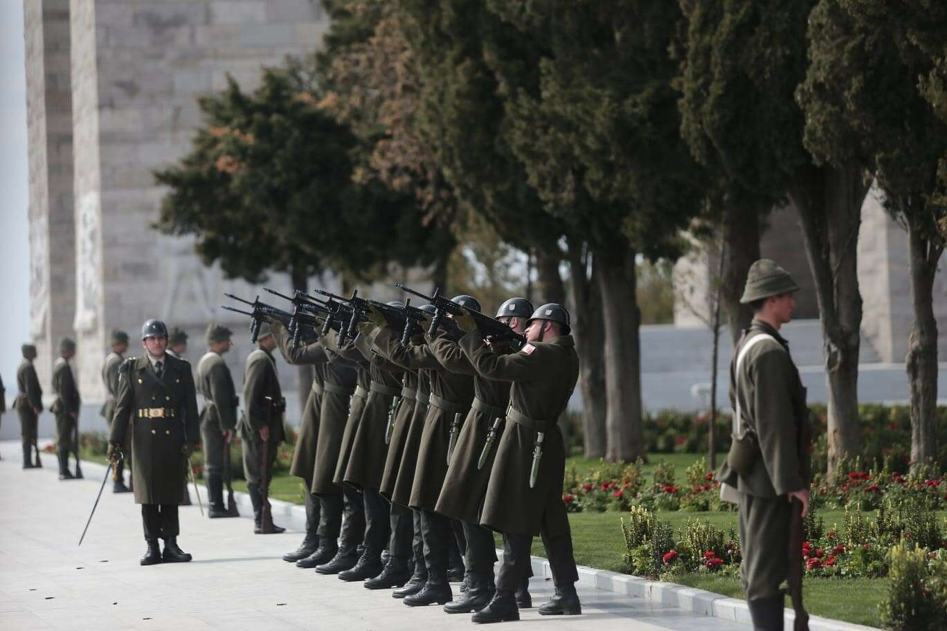 Şehitler Abidesi'ndeki 18 Mart Şehitleri Anma ve Çanakkale Deniz Zaferi'nin 108'inci yıl dönümü nedeniyle düzenlenen tören saat 14.00'da başladı. İki dev ekranın kurulduğu alanda Cumhurbaşkanlığı Külliyesi'ndeki törenlere de katılan 16 Türk devletini temsil eden üniformalı askerler de yer aldı. Cumhurbaşkanı Recep Tayyip Erdoğan helikopterle tören alanına geldi. Törene devlet protokolünün yanı sıra çok sayıda şehit yakını, gazi ve gazi yakınları katıldı. Tören, Cumhurbaşkanı Recep Tayyip Erdoğan'ın Türkiye Cumhuriyeti Devleti adına çelenk sunumuyla başladı. Ardından Milli Savunma Bakanı Hulusi Akar ve Vali İlhami Aktaş Atatürk Heykeli'ne çelenk bıraktı. Tören, saygı duruşu, saygı atışı ve İstiklal Marşı eşliğinde Türk Bayrağı'nın göndere çekilmesiyle devam etti.