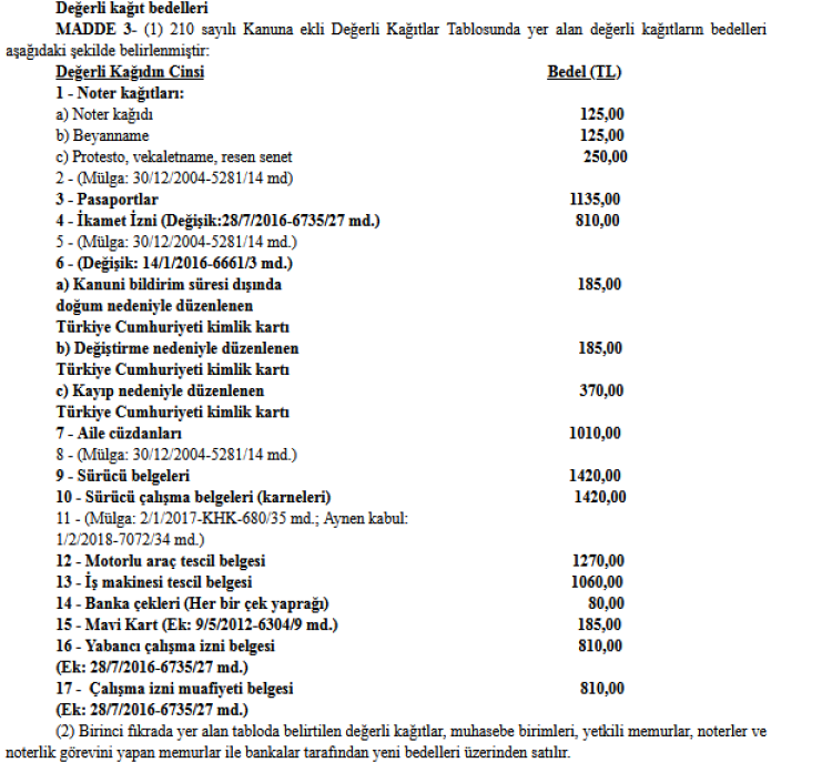 Aile cüzdanı bedeli bin 10 lira olurken, banka çekleri (her bir çek yaprağı) 80 lira, mavi kart 185 lira, yabancı çalışma ve çalışma izni muafiyeti belgeleri bedeli 810 lira olarak belirlendi.