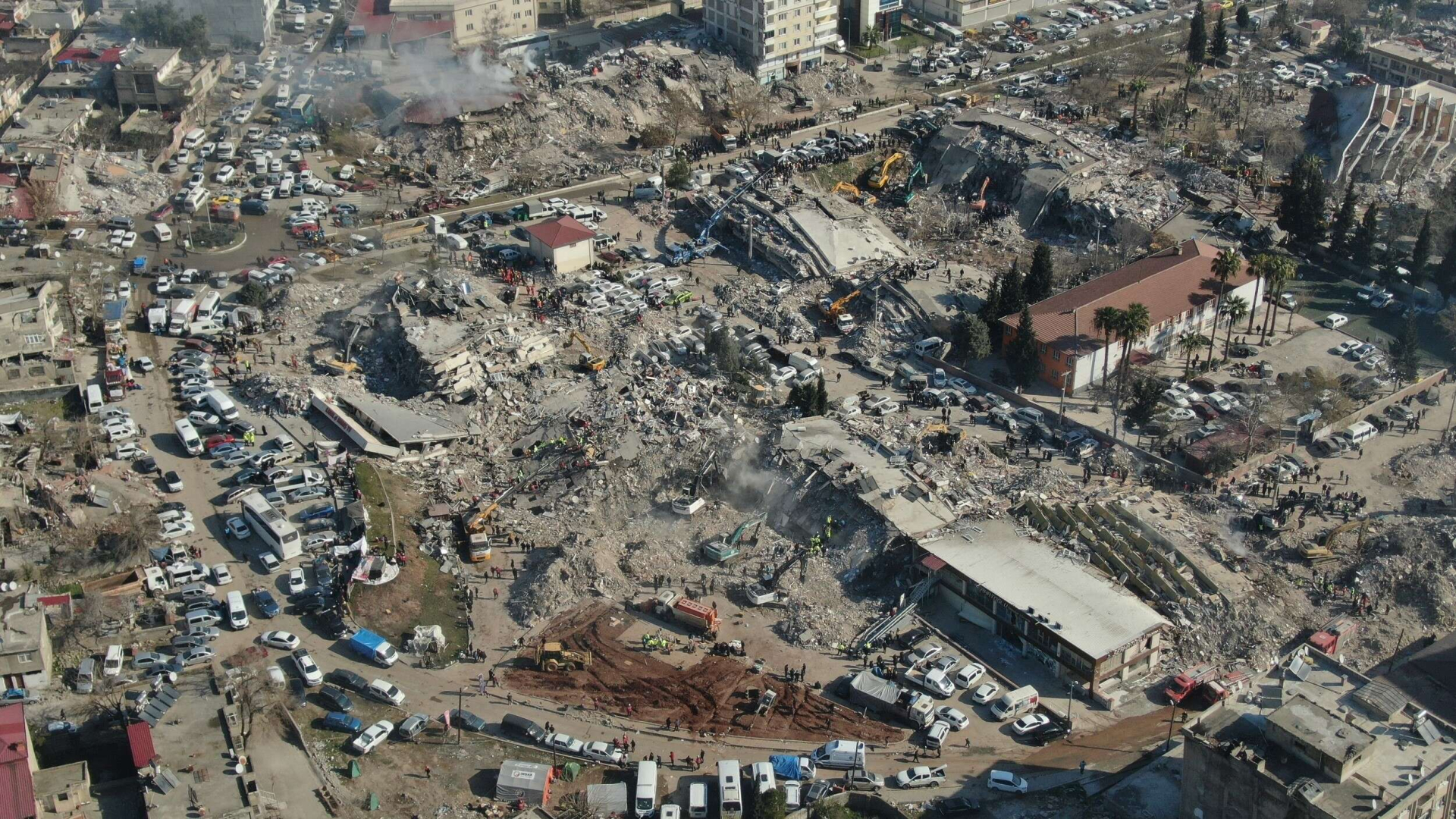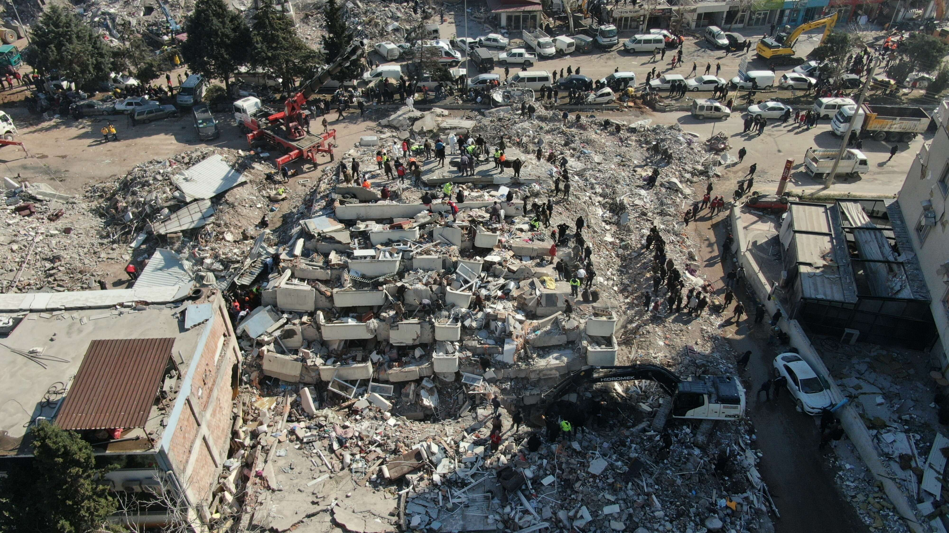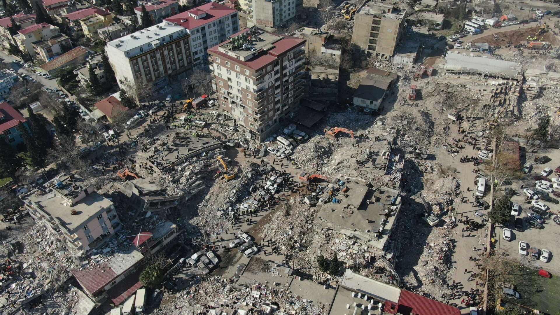 Kahramanmaraş'ta meydana gelen depremin üzerinden 82 saat geçti. Çöken binalarda mahsur kalanları kurtarmak için başlatılan çalışmalar devam ederken, iş makinelerinden de yoğun destek alınmaya başladı. Son durum dron ile havadan görüntülendi.