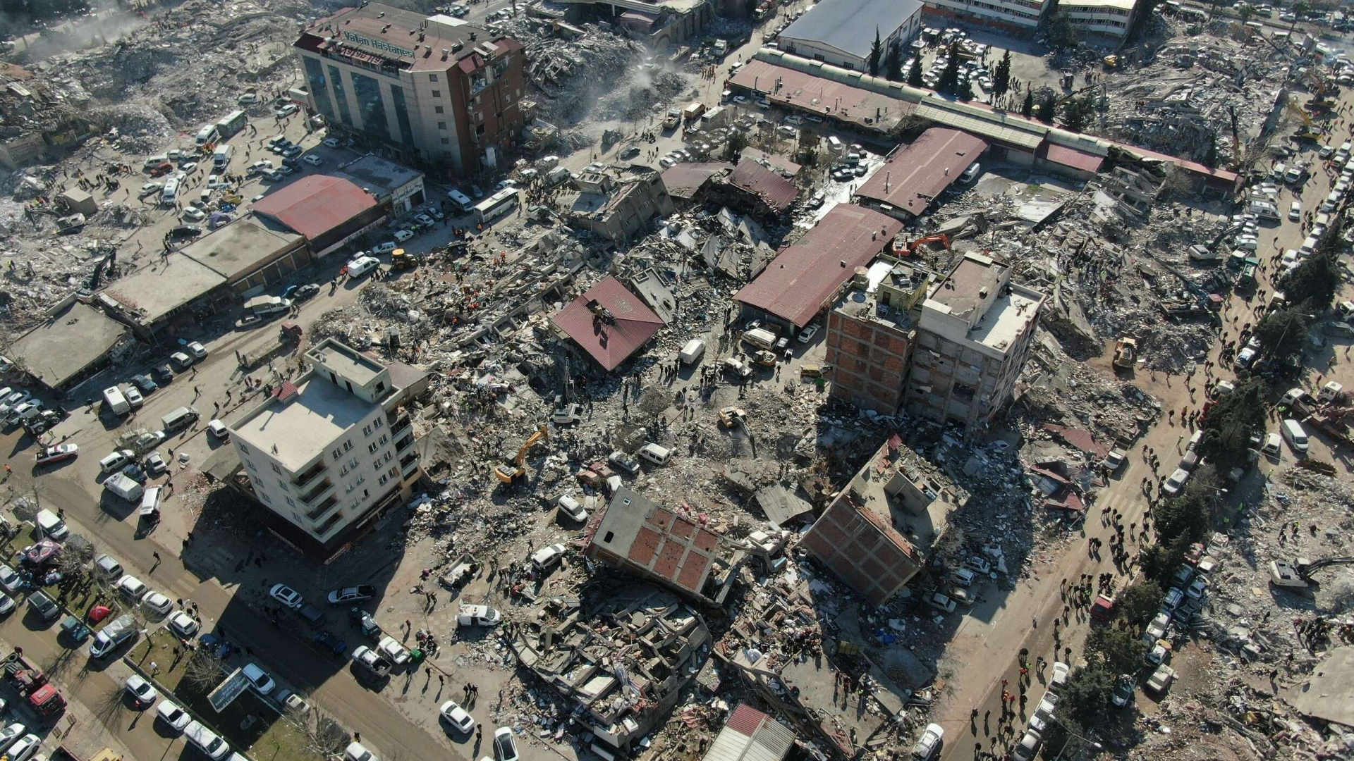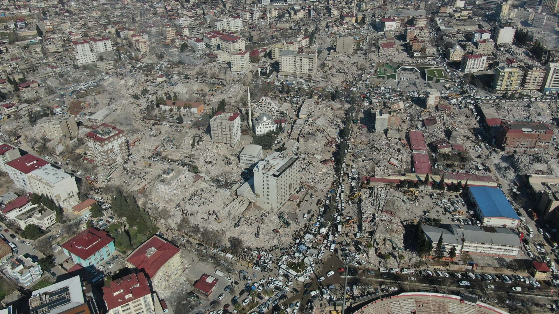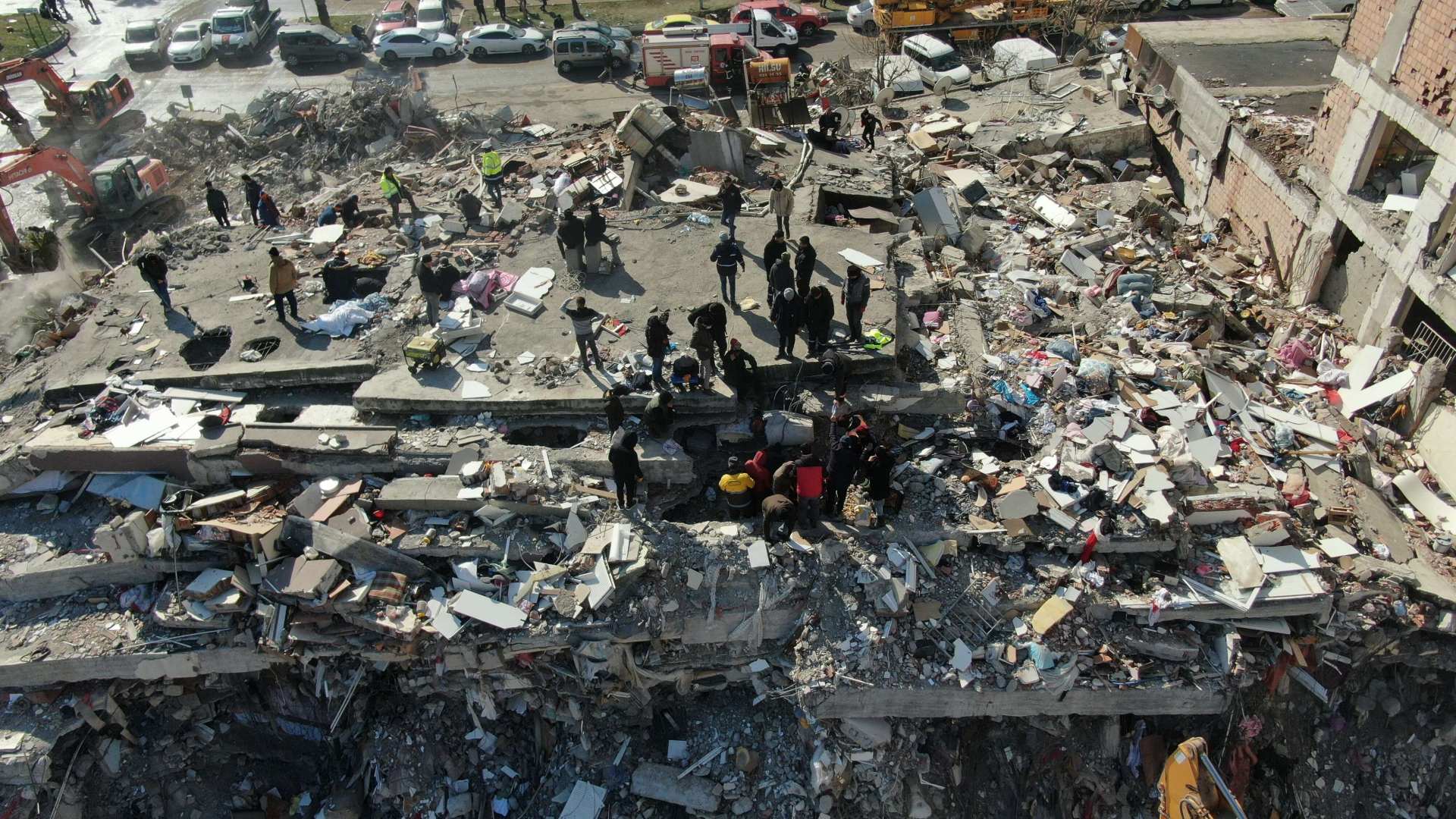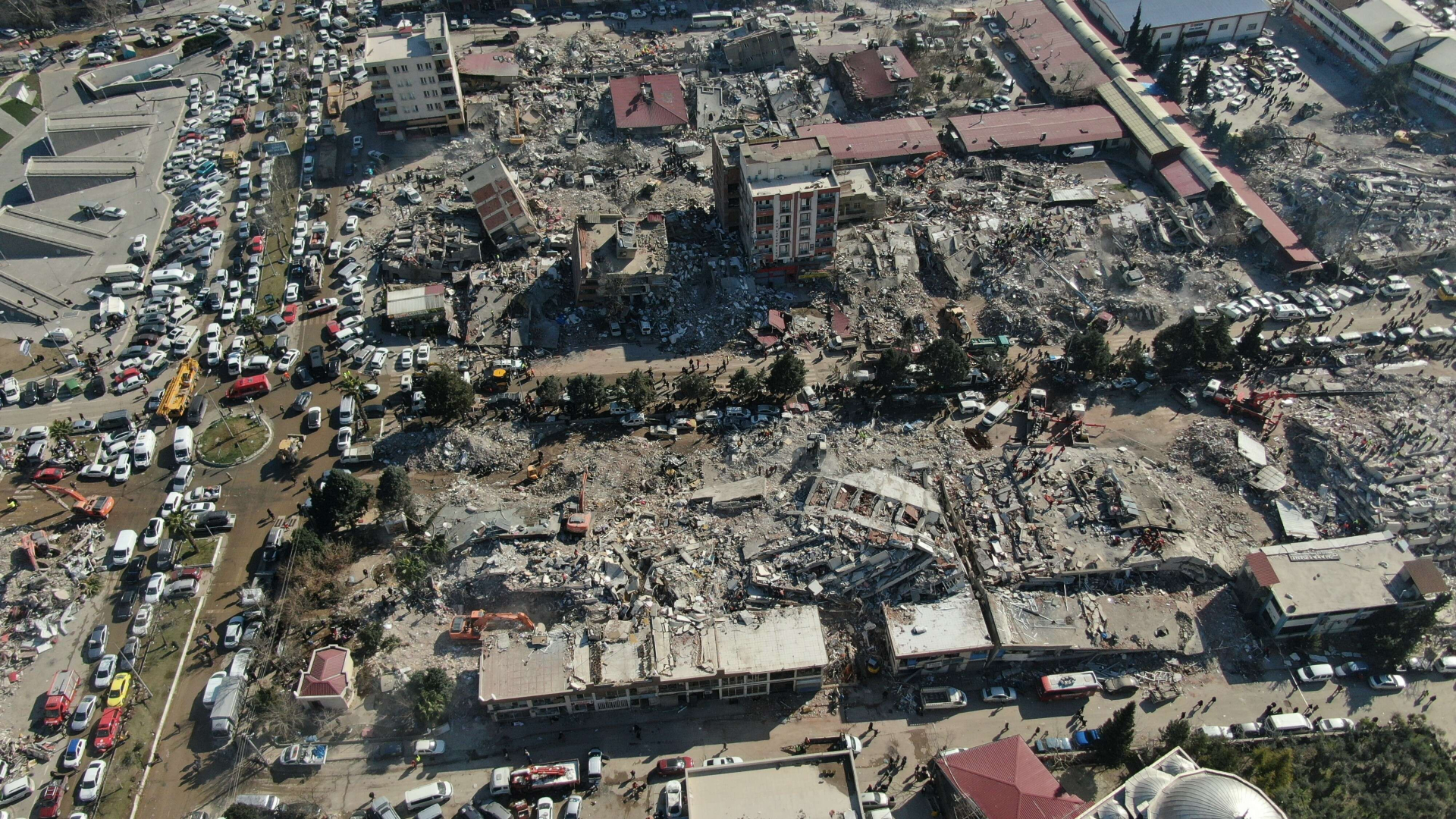 Kahramanmaraş'ta meydana gelen depremin üzerinden 82 saat geçti. Çöken binalarda mahsur kalanları kurtarmak için başlatılan çalışmalar devam ederken, iş makinelerinden de yoğun destek alınmaya başladı. Son durum dron ile havadan görüntülendi.