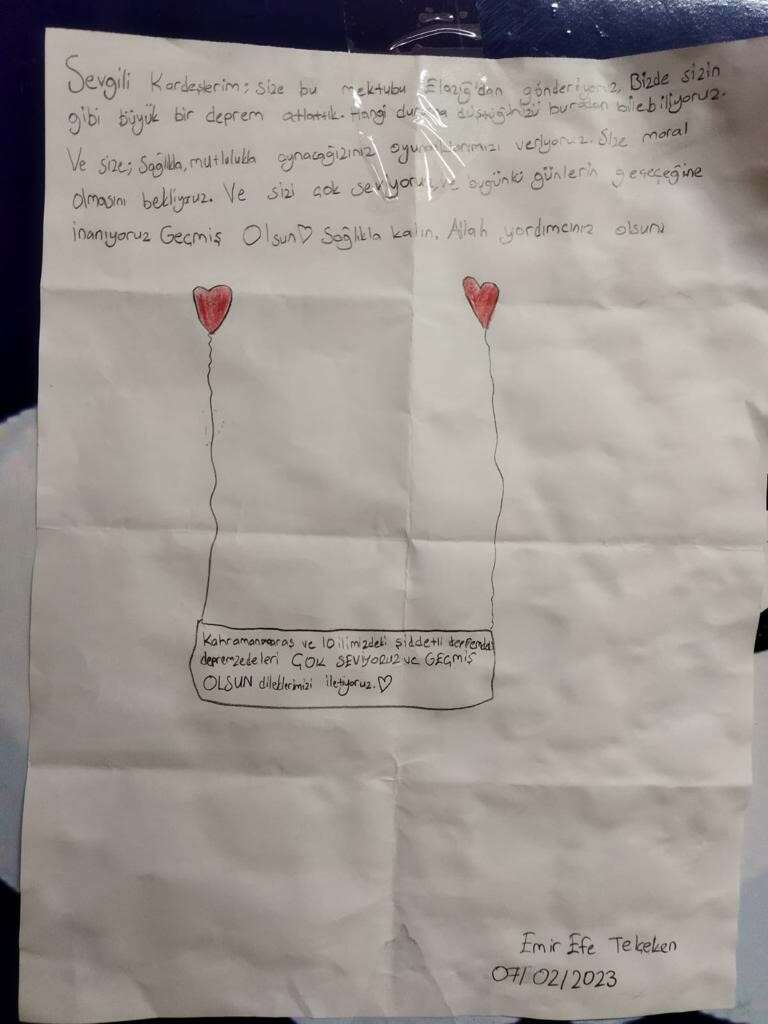 Notlarında genel olarak depremde yaşanan can kaybına çok üzüldüklerini dile getirdi. Harçlığını gönderen bir çocuk, “Ben harçlığımı çocuklar için gönderiyorum” yazarken, annesinin ördüğü hırka, atkı ve bereyi gönderen başka bir çocuk ise, “Sizler için çok üzülüyorum. Annem sizler için bu hırka, boyunluğu ördü. İnşallah kendinizi yalnız hissetmezsiniz” notunu yazdı.