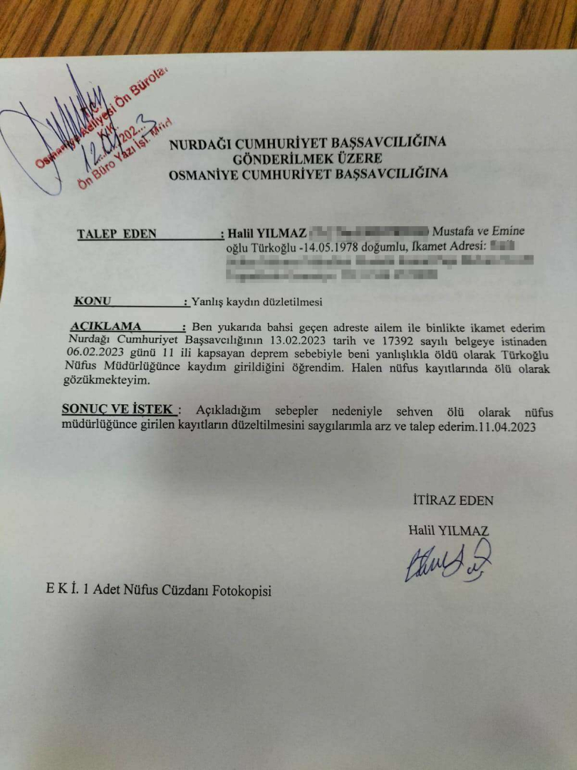 Yaşadıklarını anlatan Halil Yılmaz, "Asrın felaketi 6 Şubat depreminde Nurdağı'nda 'ölü' olarak görünüyorum, depremin olduğu gün ben Toprakkale'de ikamet ettiğim evimdeydim bir yanlışlık olmuş kayıtlara depremde Nurdağı’nda öldüğüm yazılmış. Kayıtlara 'ölü' olarak yazıldığımı e-devlet üzerinden öğrendim e-devletime giremediğimden dolayı eşime söyledim. E-devletine girdiğinde baktığında kendisinin 'dul' olduğunu benim de 'ölü' olduğumu gördü. Gerekli yerlere dilekçemi verdi, yetkililerden yardım bekliyorum" dedi.