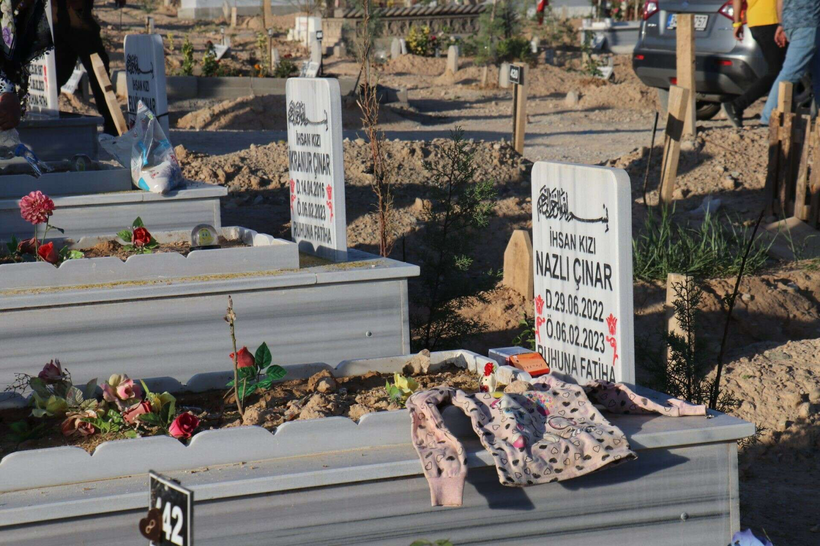 Kimi eşini, kimi annesini kimi ise çocuklarını ve tüm yakınlarını kaybeden depremzedeler bayram namazının ardından kabristana akın etti. Yakınlarının mezarları başında dua eden aileler, gözyaşları döktü. Mezarlıktaki yürekleri yakan görüntüler yaşanırken, depremin minik kurbanlarının kabirleri de en sevdikleri elbiseler ile süslendi.