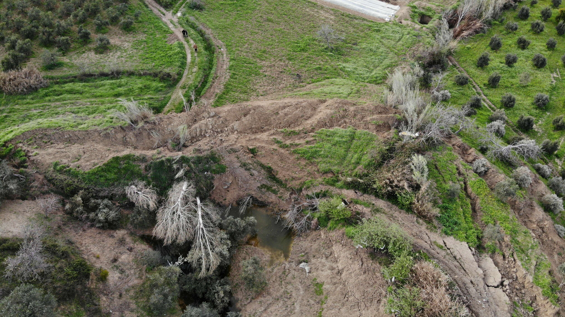 Tepehan Mahalle Muhtarı Selahattin Kandemir, 6 Şubat’ta meydana gelen depremde zeytin bahçesinde oluşan yarığın bulunduğu bölgede büyük bir patlama olduğunu belirtti.