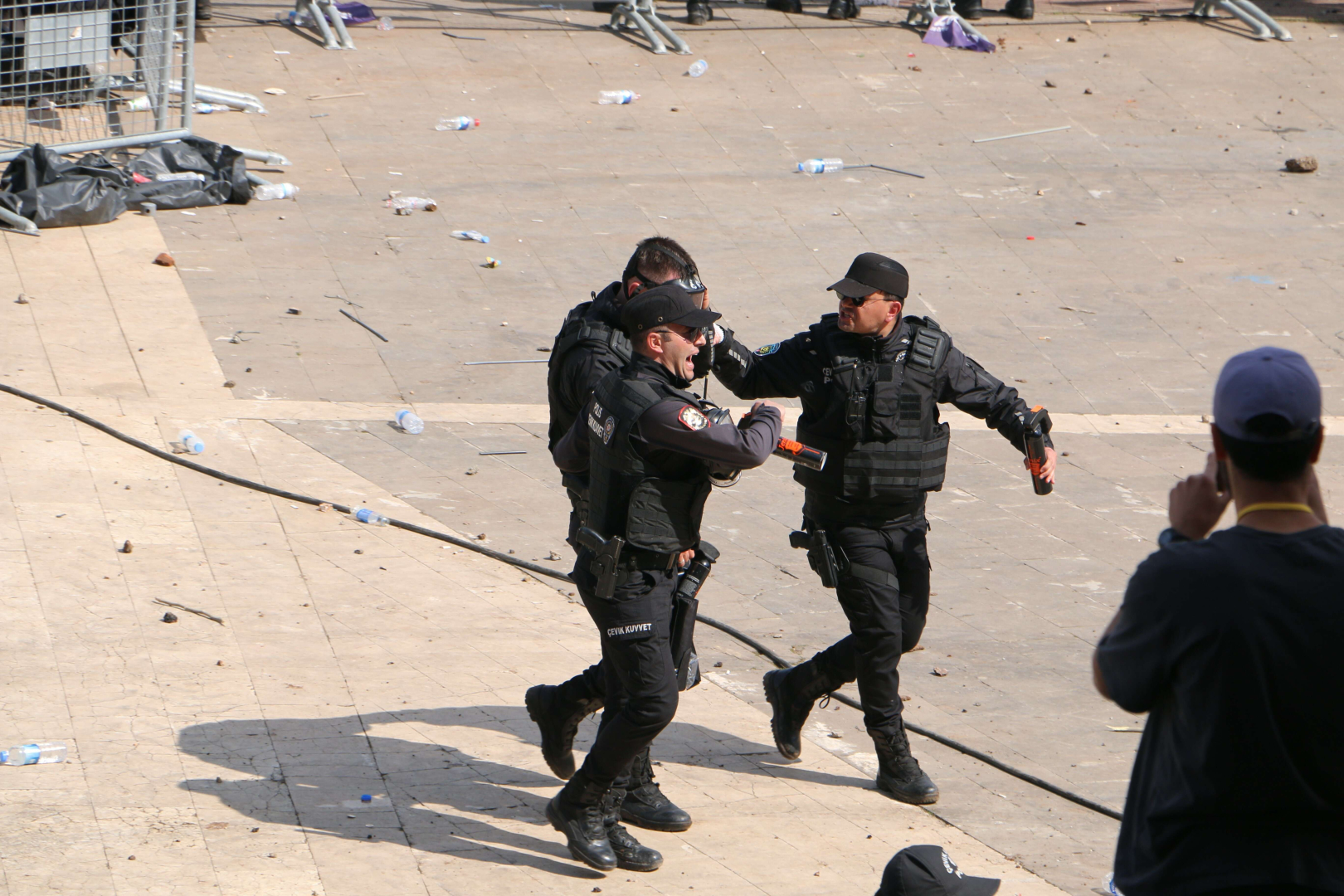 Alandaki bazı terör yandaşları, yüzlerini kapatarak alanda görevli polis ekiplerine taş ve su şişeleri fırlattı. Yaralanan polisler alandan çıkartıldı.