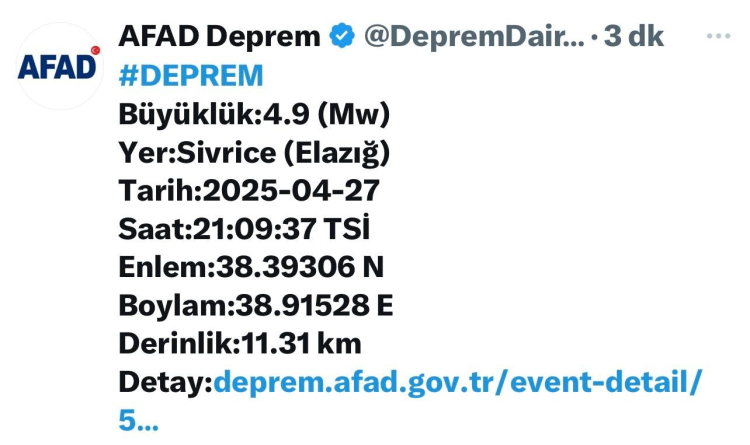 AFAD’dan yapılan açıklamaya göre, saat 21.09’da merkez üssü Elazığ’ın Sivrice ilçesi olan 4,9 büyüklüğünde deprem meydana geldi. Yerin 11 kilometre altında meydana gelen depremde şu ana kadar herhangi bir olumsuzluğa rastlanmadığı öğrenildi.