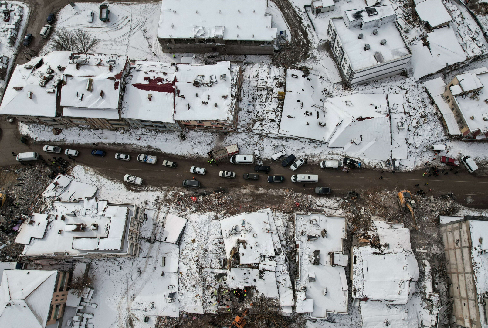 Termometrelerin -10 dereceleri gösterdiği ilçede enkazın üstüne beyaz örtü kapladı. Oluşan acı manzara dron ile havadan görüntülendi.