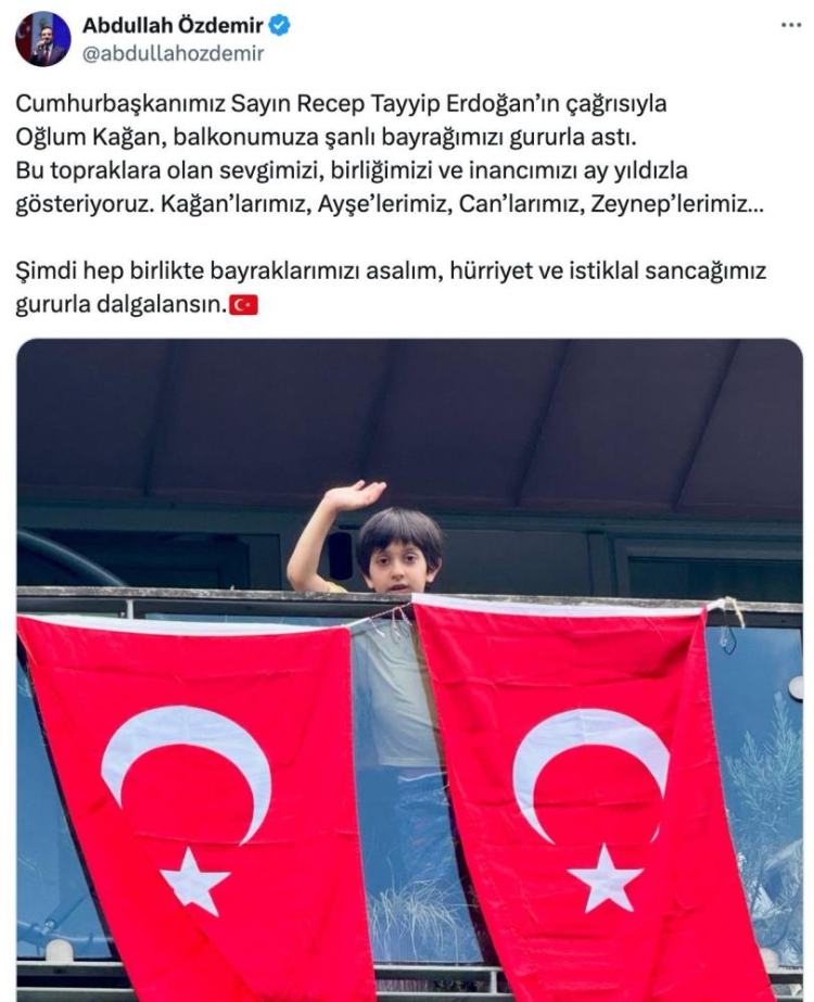 "Cumhurbaşkanımız Sayın Recep Tayyip Erdoğan'ın çağrısıyla Oğlum Kağan, balkonumuza şanlı bayrağımızı gururla astı. Bu topraklara olan sevgimizi, birliğimizi ve inancımızı ay yıldızla gösteriyoruz. Kağan'larımız, Ayşe'lerimiz, Can'larımız, Zeynep'lerimiz Şimdi hep birlikte bayraklarımızı asalım, hürriyet ve istiklal sancağımız gururla dalgalansın."