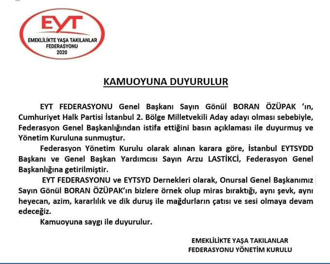 Konuyla ilgili EYT Federasyonu'ndan yapılan açıklamaya göre Emeklilikte Yaşa Takılanlar Federasyonu'nun yeni başkanı Arzu Lastikci oldu.