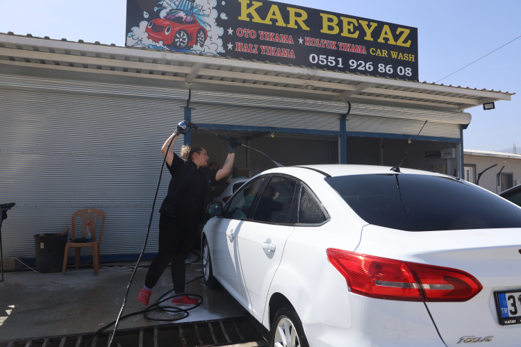 Hatay’da yaşayan Aslı Pekşen Ertürk, 6 ay önce açtıkları oto yıkama iş yerinde kayınpederi olan Selahattin Ertürk ile birlikte mesai yapıyor.