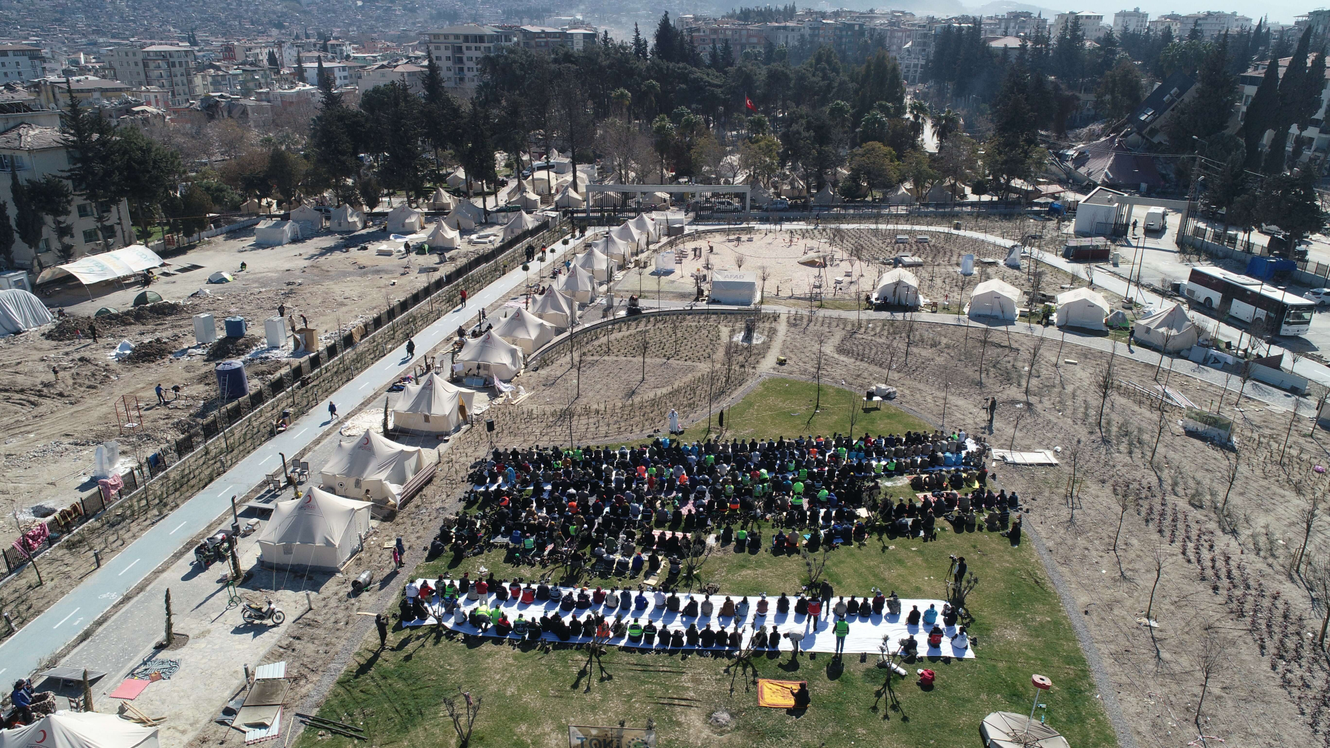 Kahramanmaraş depreminin büyük hasar verdiği illerden biri olan Hatay'da çadırkentler ve güvenli toplanma alanlarında cuma namazı ve gıyabi cenaze namazı kılındı. Askerler, arama kurtarma görevlileri ve vatandaşların katıldığı namaz, dron ile havadan görüntülendi.