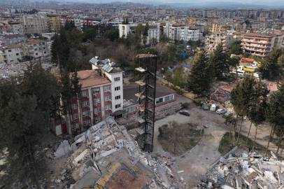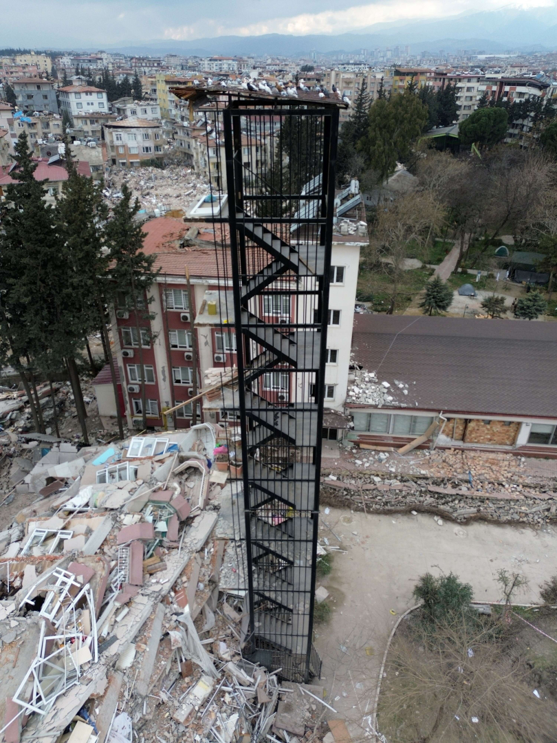 Hatay'da dün akşam meydana gelen 6,4 büyüklüğündeki depremde Mustafa Kemal Üniversitesi Mimarlık Fakültesi Misafirhanesi yıkıldı, binanın yangın merdiveni ise ayakta kaldı. İlginç görüntü, dron kamerasına yansıdı.