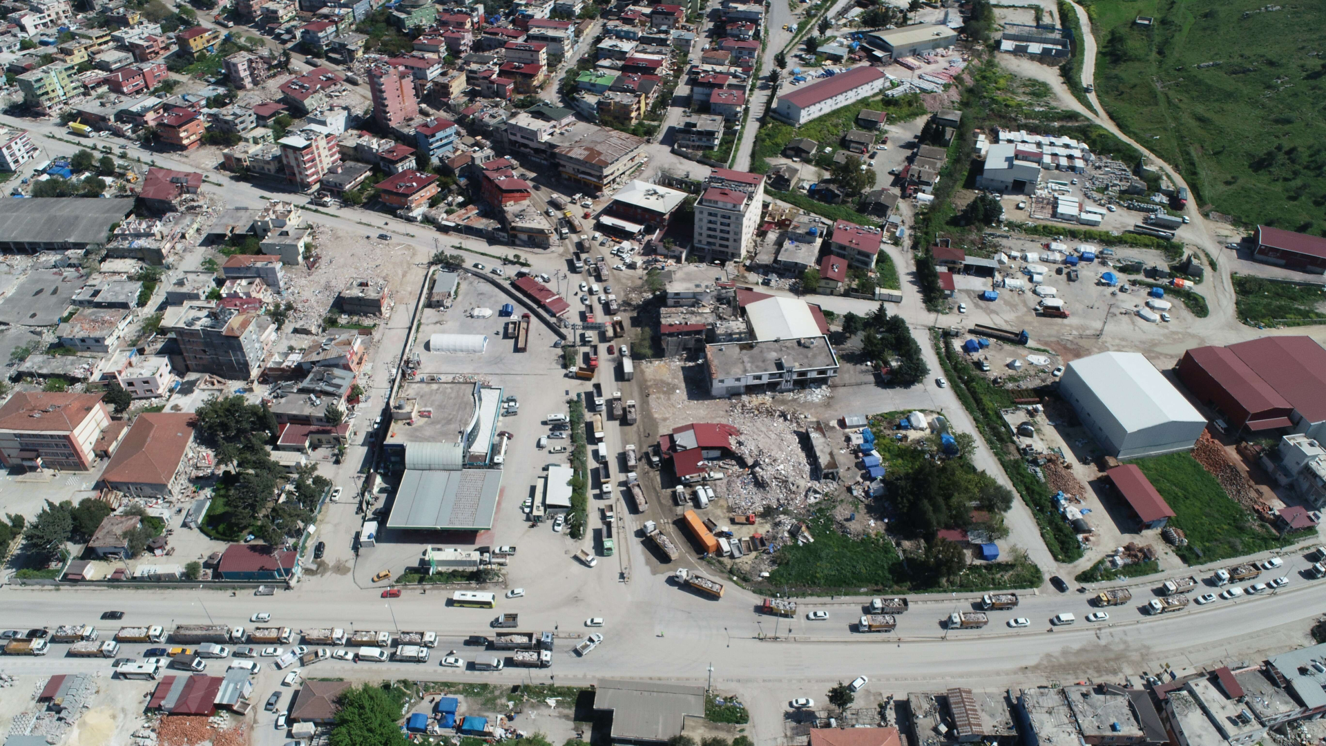 Hatay'da 'asrın felaketi' olarak adlandırılan depremin ardından enkaz kaldırma çalışmaları hız kesmeden devam ediyor. Kamyonların oluşturduğu kuyruk ve vadiye dökülen molozlardan oluşan dağ havadan görüntülendi.