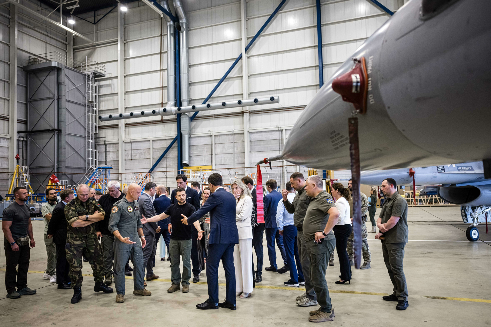 ABD’nin F-16 savaş uçaklarının Ukrayna’ya teslimatı konusunda Hollanda ve Danimarka’ya onay vermesinin ardından Ukrayna Devlet Başkanı Vladimir Zelenskiy, Hollanda’yı ziyaret etti. Hollanda’nın Eindhoven kentindeki askeri havaalanında Hollanda Başbakanı Mark Rutte ve Dışişleri Bakanı Wopke Hoekstra tarafından karşılanan Zelenskiy, Ukrayna’ya verilmesi planlanan uçakları inceledi. İkili daha sonra ortak basın toplantısı düzenledi.