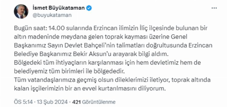 Milliyetçi Hareket Partisi Genel Sekreteri ve Bursa Milletvekili İsmet Büyükataman Erzincan'ın İliç ilçesindeki maden sahasında meydana gelen toprak kaymasına ilişkin sosyal medya hesabından açıklama yaptı.