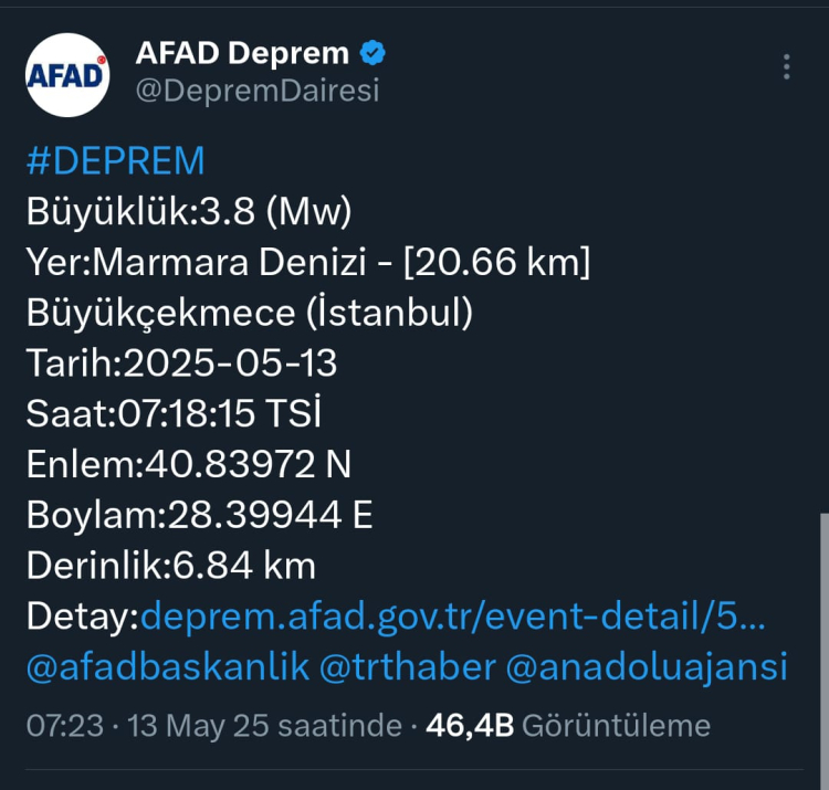 Afet ve Acil Durum Yönetimi Başkanlığı'ndan (AFAD) alınan bilgiye göre, saat 07.18'de merkez üssü Marmara Denizi Büyükçekmece açıkları olan 4.3 büyüklüğünde deprem kaydedildi. Sarsıntı yerin 6.84 kilometre derinliğinde meydana geldi