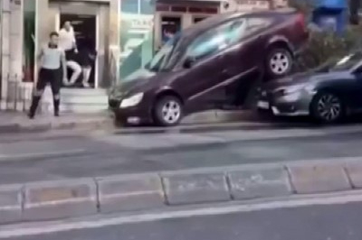 İstanbul Fatih’te bir sürücü, park halindeki aracını çıkarmak isterken gaza fazla yüklenince arkasındaki park halindeki başka aracın üzerine çıktı.
