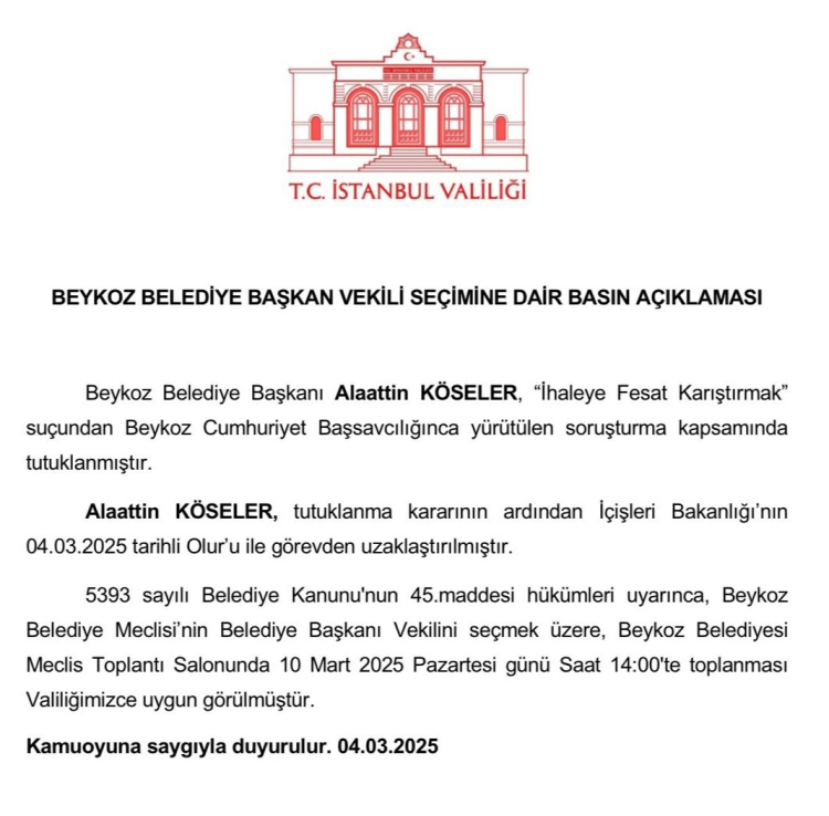 İstanbul Valiliği'nden yapılan açıklamada, "Beykoz Belediye Başkanı Alaattin Köseler, 'İhaleye Fesat Karıştırmak' suçundan Beykoz Cumhuriyet Başsavcılığınca yürütülen soruşturma kapsamında tutuklanmıştır. Alaattin KÖSELER, tutuklanma kararının ardından İçişleri Bakanlığı'nın 04.03.2025 tarihli Olur'u ile görevden uzaklaştırılmıştır. 5393 sayılı Belediye Kanunu'nun 45.maddesi hükümleri uyarınca, Beykoz Belediye Meclisi'nin Belediye Başkanı Vekilini seçmek üzere, Beykoz Belediyesi Meclis Toplantı Salonunda 10 Mart 2025 Pazartesi günü Saat 14:00'te toplanması Valiliğimizce uygun görülmüştür. Kamuoyuna saygıyla duyurulur." ifadelerine yer verildi.