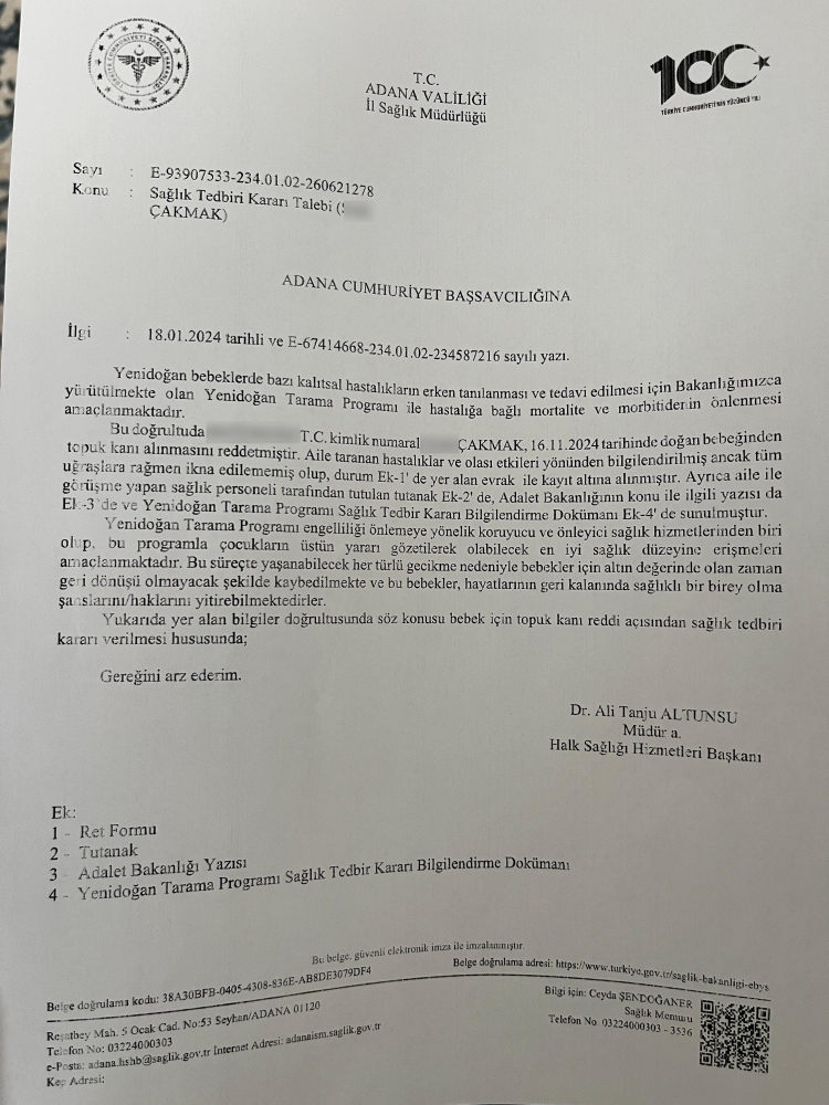 Ancak topuk kanı alınmayıp aşı yapılmadığı için özel hastane durumu çiftin ikamet ettiği mahallenin sağlık ocağına, onlarda Sağlık Bakanlığı'na bildirdi. Topuk kanı aldırmayan aile hakkında Sağlık Bakanlığı şikayetçi oldu ve Adana 6. Sulh Hukuk Mahkemesi'nde dava açıldı. Açılan davada mahkeme, ailenin ifadesine başvurdu. 2.5 aylık M.T. için kayyum atanmasına karar verdi. Aile, mahkeme sürecinde Murat Çakmak'ın kardeşi F.Ç.'yi evlatlarının vasisi olarak mahkemeye bildirdi.