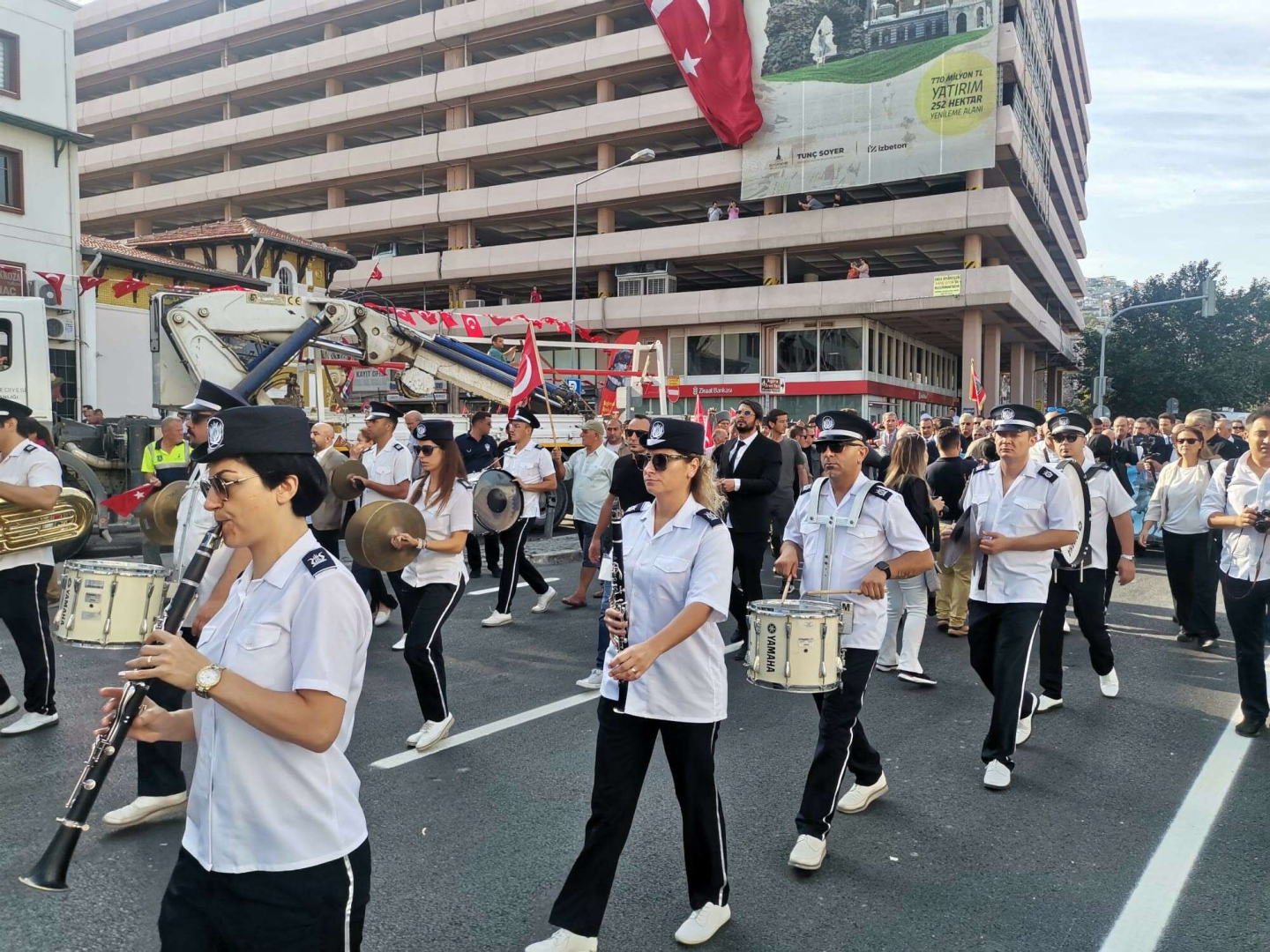 İzmir’in düşman işgalinden kurtuluşunun 101. yıl dönümü etkinlikleri, 350 metrelik dev Türk bayrağının binlerce İzmirli tarafından taşınmasıyla yapılan geleneksel Zafer Yürüyüşü ile başladı. Ardından Cumhuriyet Meydanı'nda Atatürk büstüne protokol üyeleri tarafından çelenk sunumunda bulunuldu.