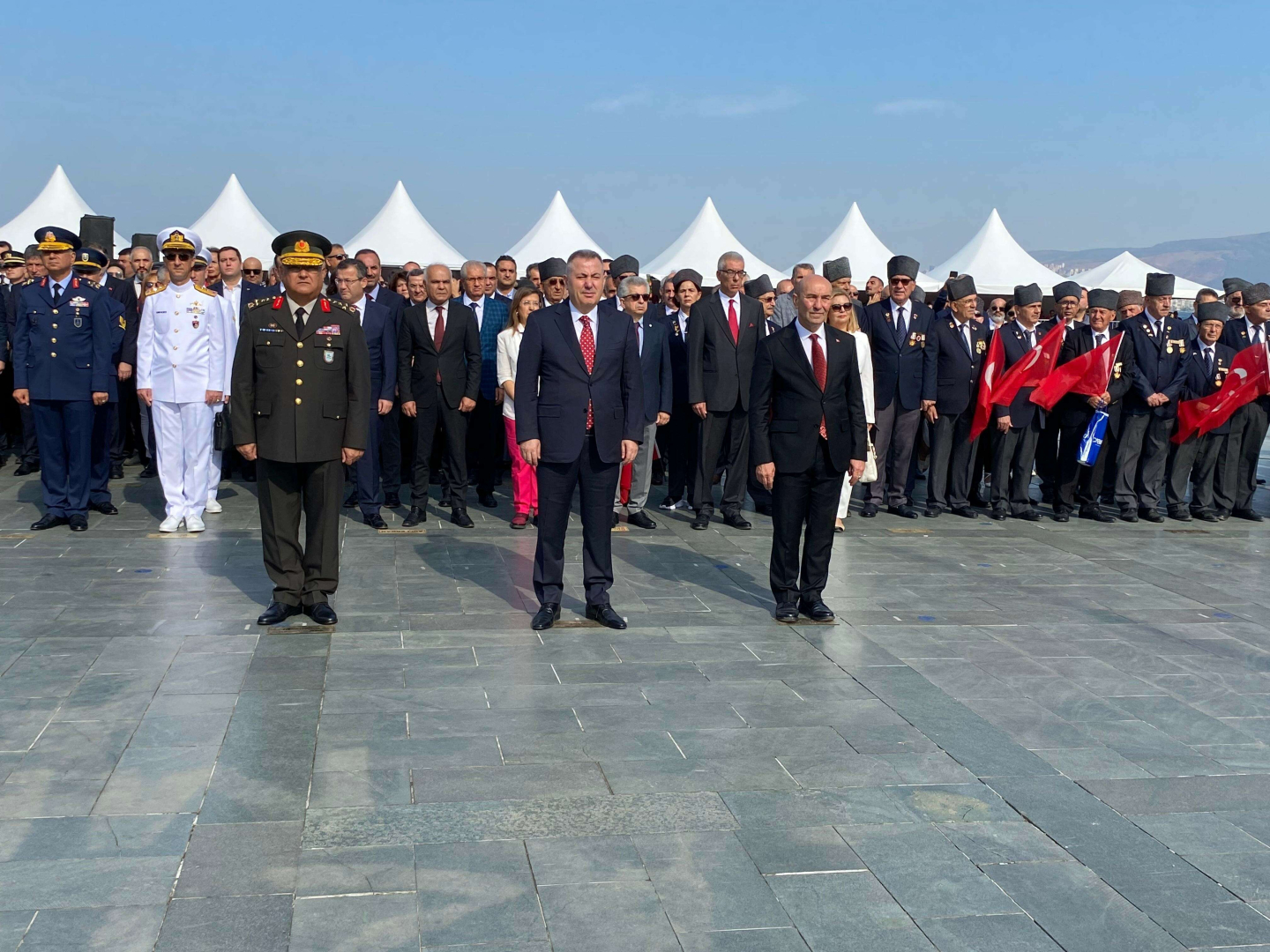 Cumhuriyet Meydanı'ndaki çelenk sunma töreninde ise İzmir Valisi Süleyman Elban, Ege Ordusu Komutanı Orgeneral Kemal Yeni ve İzmir Büyükşehir Belediye Başkanı Tunç Soyer, çelenklerini Atatürk büstüne sundu. Ardından Türk bayrakları göndere çekilerek saygı duruşunda bulunulup İstiklal Marşı okundu. 9 Eylül etkinlikleri gece geç saatlere kadar sürecek.