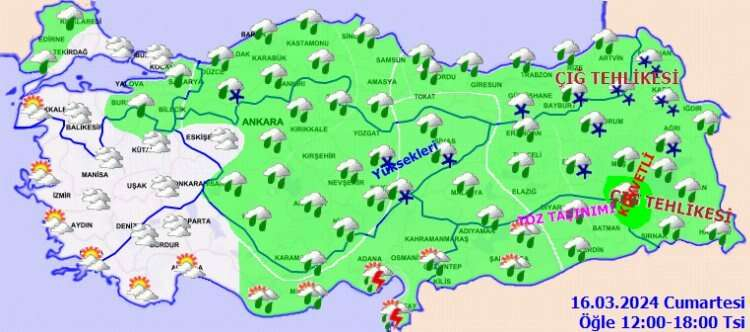 Meteoroloji Genel Müdürlüğü tarafından yapılan son tahminlere göre; Ülkemiz genelinin parçalı ve çok bulutlu, Marmara'nın doğusu, Orta ve Doğu Akdeniz, İç Anadolu(Eskişehir hariç), Karadeniz, Doğu ve Güney Anadolu ile Edirne ve Kırklareli çevrelerinin yağışlı geçeceği tahmin ediliyor. Genellikle yağmur ve sağanak, İç Anadolu'nun doğusunun yüksekleri, Doğu Karadeniz'in iç kesimleri, Doğu Anadolu'nun kuzey ve doğusu ile Doğu Akdeniz'in yüksek kesimlerinde karla karışık yağmur ve kar şeklinde görülmesi beklenen yağışların, Bitlis ve Siirt çevrelerinin yerel kuvvetli olması bekleniyor. Doğu Karadeniz’in iç kesimleri, Doğu Anadolu’nun kuzey ve doğusu ile Orta Torosların yüksek kar örtüsüne sahip dik yamaçlarında çığ tehlikesi bulunmaktadır. Yurdun güneydoğu kesimlerinde toz taşınımı bekleniyor.