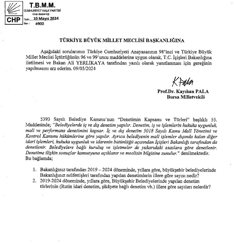 CHP Bursa Milletvekili Prof.Dr. Kayıhan Pala, İçişleri Bakanı Ali Yerlikaya’ya 2019-2024 döneminde büyükşehir belediyelerine yapılan denetimleri sordu.