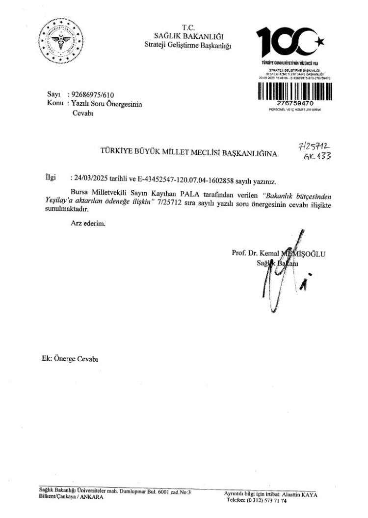 “2024 yılı bütçesinde Yeşilay için başlangıçta 1 milyar 65 milyon 100 bin TL ödenek ayrıldığını, ancak bu tutarın yıl içinde 1 milyar 240 milyon 100 bin TL’ye çıkarılarak tamamının harcandığını tespit ettik. Ardından, devletin mali disiplininin temeli olan 5018 sayılı Kamu Mali Yönetimi ve Kontrol Kanunu’na dayanarak Sağlık Bakanı’na son derece net sorular yönelttik:
