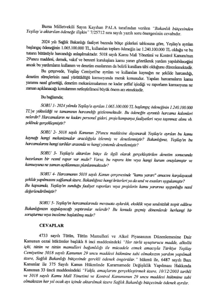 CHP Bursa Milletvekili ve Sağlık, Aile, Çalışma ve Sosyal İşler Komisyonu Üyesi Prof. Dr. Kayıhan Pala, Sağlık Bakanlığı bütçesinden Yeşilay'a 2024 yılında aktarılan 1 milyar 240 milyon TL’lik devasa kamu kaynağının akıbetine ilişkin sunduğu yazılı soru önergesine Bakanlığın verdiği yanıtın, skandal niteliğinde bir "denetimden kaçışı" itiraf ettiğini açıkladı.