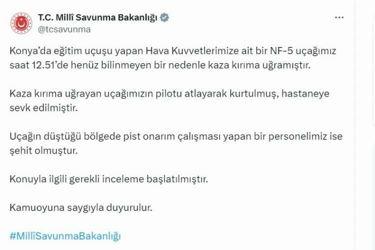 Bakanlıktan yapılan açıklamada; "Konya'da eğitim uçuşu yapan Hava Kuvvetlerimize ait bir NF-5 uçağımız saat 12.51'de henüz bilinmeyen bir nedenle kaza kırıma uğramıştır. Kaza kırıma uğrayan uçağımızın pilotu atlayarak kurtulmuş, hastaneye sevk edilmiştir. Uçağın düştüğü bölgede pist onarım çalışması yapan bir personelimiz ise şehit olmuştur. Konuyla ilgili gerekli inceleme başlatılmıştır." ifadeleri yer aldı.