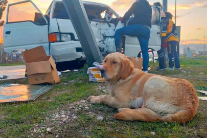 Köpek, kaza yapan ve araçta sıkışan sahibinin yanından ayrılmadı