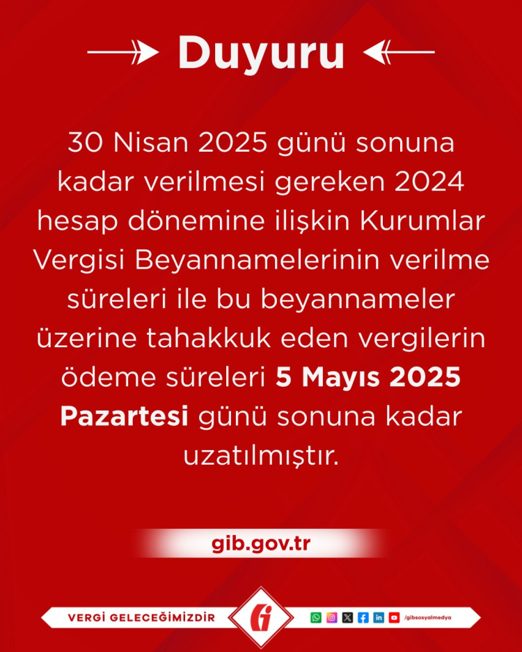 Gelir İdaresi Başkanlığı'ndan yapılan açıklamaya göre, Kurumlar Vergisi beyannamelerinin verilme ve tahakkuk eden vergilerin ödeme süreleri, 30 Nisan 2025’ten 5 Mayıs 2025 Pazartesi günü sonuna kadar uzatıldı.