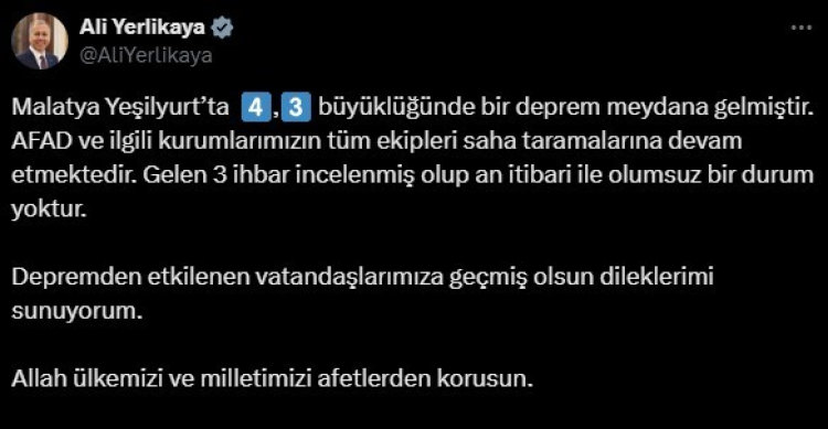 Öte yandan depremle ilgili sosyal medya hesabından açıklama yapan İçişleri Bakanı Ali Yerlikaya, "Malatya Yeşilyurt'ta 4.3 büyüklüğünde bir deprem meydana gelmiştir. AFAD ve ilgili kurumlarımızın tüm ekipleri saha taramalarına devam etmektedir. Gelen 3 ihbar incelenmiş olup an itibari ile olumsuz bir durum yoktur. Depremden etkilenen vatandaşlarımıza geçmiş olsun dileklerimi sunuyorum. Allah ülkemizi ve milletimizi afetlerden korusun.