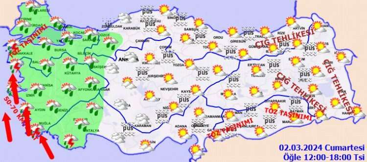 KUVVETLİ RÜZGAR UYARISI: Rüzgarın, Kıyı Ege’de güney ve güneydoğu yönlerden kuvvetli (50-70 km/saat) olarak esmesi beklendiğinden yaşanabilecek olumsuzluklara karşı dikkatli ve tedbirli olunmalıdır.