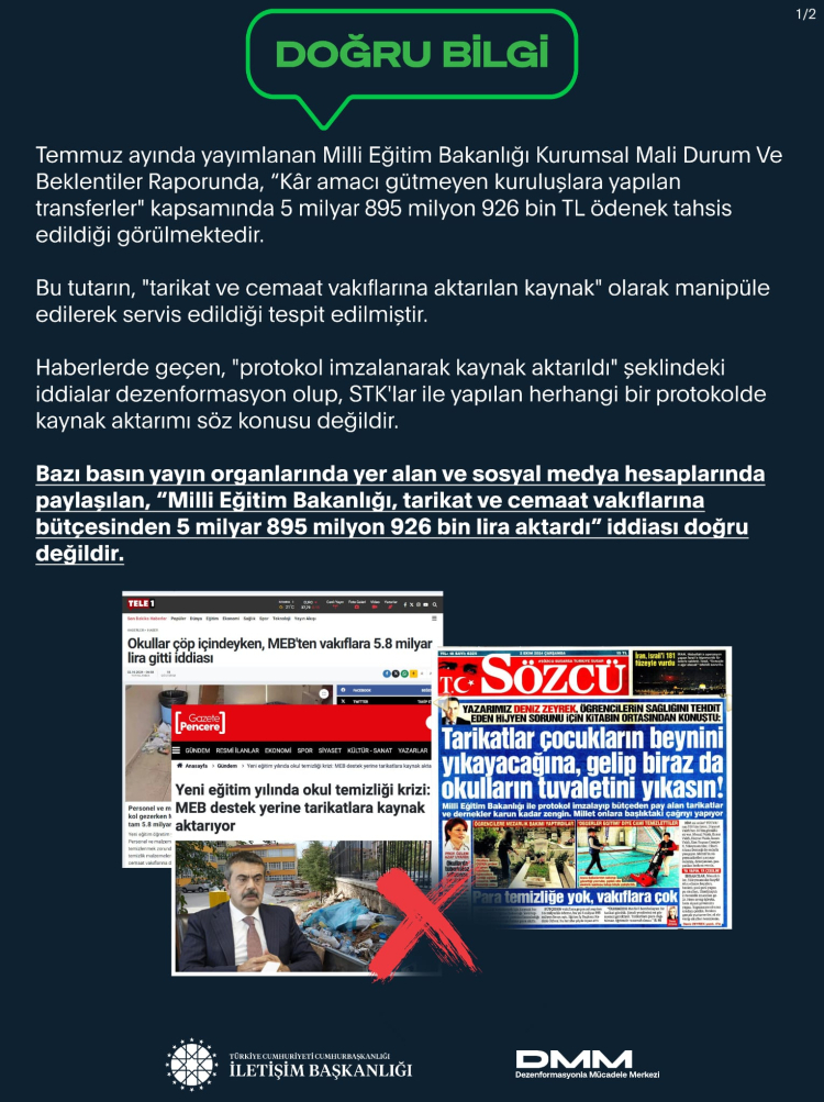 İletişim Başkanlığı, bazı basın yayın organlarında yer alan ve sosyal medya hesaplarında paylaşılan, “Milli Eğitim Bakanlığı, tarikat ve cemaat vakıflarına bütçesinden 5 milyar 895 milyon 926 bin lira aktardı” iddiası doğru olmadığını açıkladı.