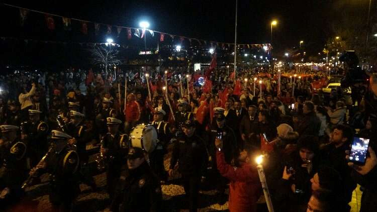Binlerce kişi, Çanakkale sokaklarında ellerinde meşalelerle “Mustafa Kemal’in askerleriyiz” sloganı atıp, İzmir Marşı ve 10’uncu Yıl Marşı’nı söyleyerek yürüdü. Yürüyüşe Çanakkale Valisi İlhami Aktaş, Çanakkale Belediye Başkanı Ülgür Gökhan, Çanakkale Savaşları Gelibolu Tarihi Alan Başkanı İsmail Kaşdemir, daire müdürleri ve vatandaşlar katıldı.