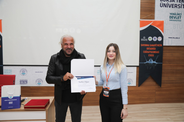Güvenlik Politikaları Uzmanı Mete Yarar, Bursa Teknik Üniversitesi'nde “Savunma Sanayii'mizin Ortadoğu Coğrafyasındaki Etklileri” konulu konferans verdi. BTÜ İnsan ve Toplum Bilimleri Fakültesi (İTBF) Dekanı Prof. Dr. Hilal Yıldırır Keser ile birlikte çok sayıda akademisyenin, sivil toplum kuruluşu temsilcisinin ve öğrencilerin katıldığı programın başında milli muharip uçağı Kaan'ın tanıtım videosunun gösterime sunuldu.