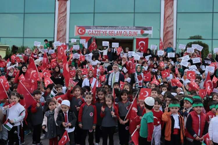 Konuşların ardından çocuklar ellerini semaya açarak, Filistin için dua ederken, ‘Gazze bizim, Kudüs bizim, katil İsrail’ diye slogan attılar.